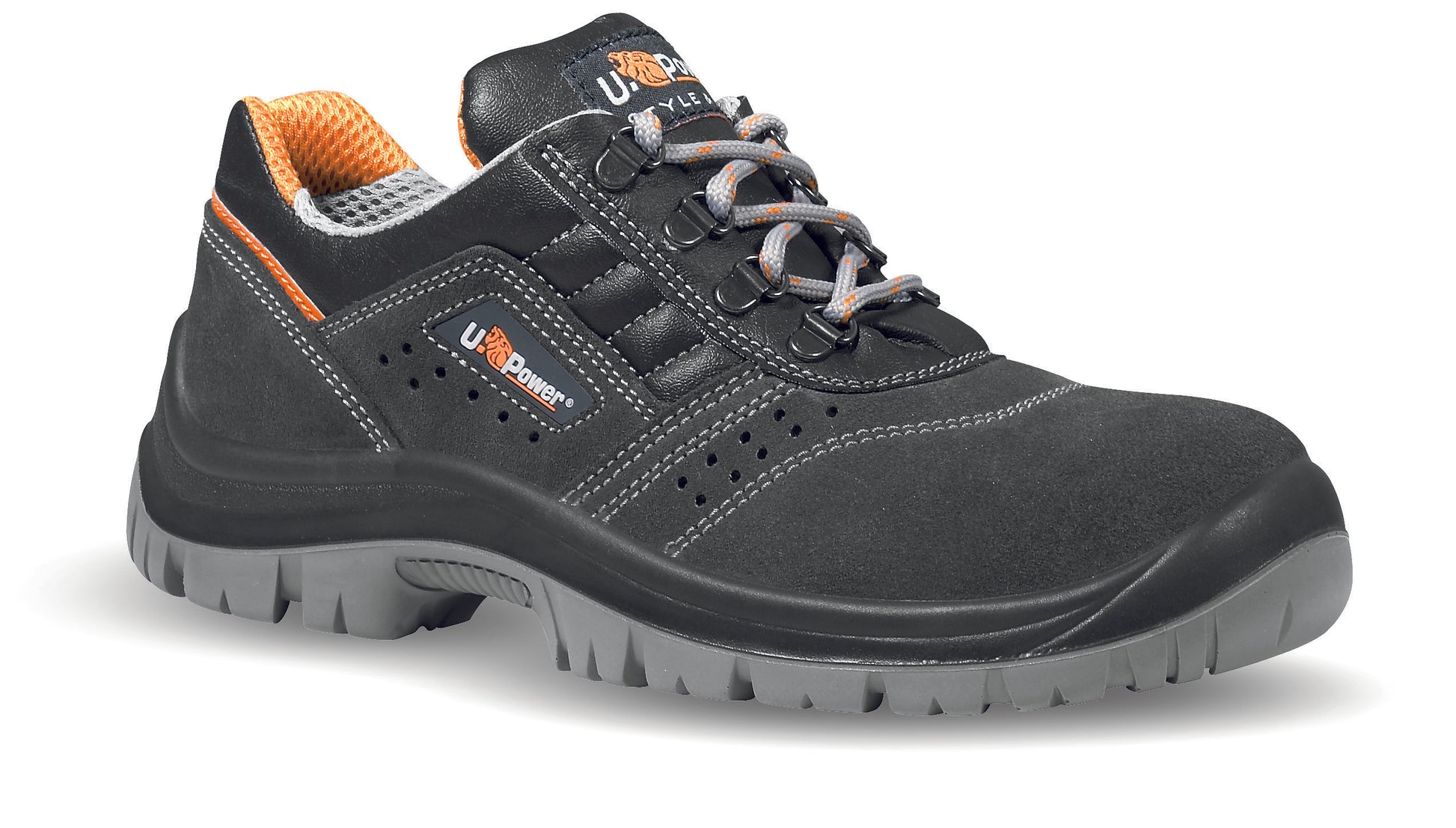 Scarpe antinfortunistiche basse, classiche e robuste u power della linea Style&Job, con tomaia in pelle scamosciata forata, puntale in acciaio, antiperforazione, antiscivolo, lamina in acciaio ergonomica e suola PU/PU, S1P SRC