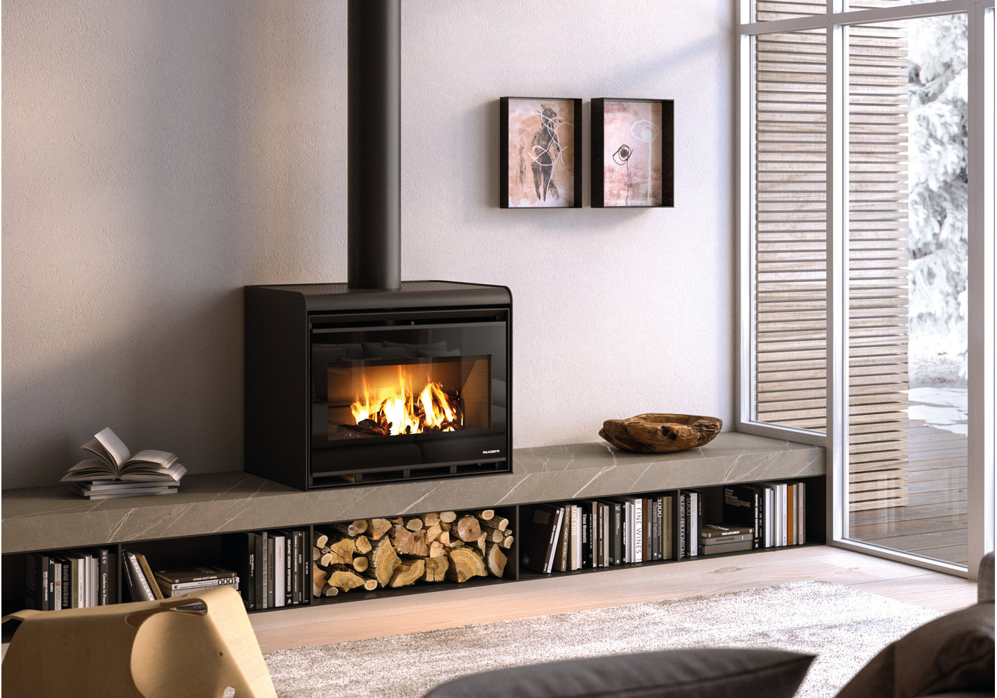 - può essere installata in appoggio oppure essere completata con la base-portalegna optional